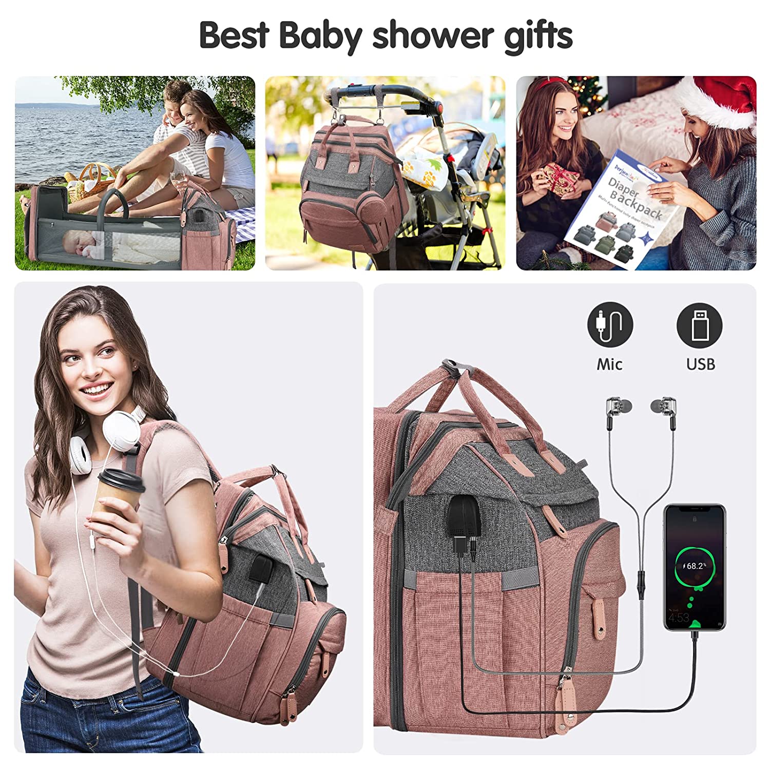 - Baby Bags for Boys Girls,Waterproof Changing Pad,USB Charging Port,Pacifier Case, Sunshade and Toy Bar, Pale Pink