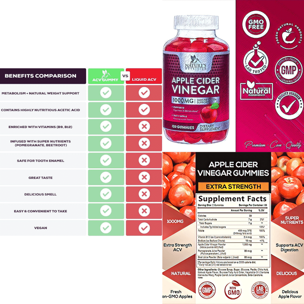 Apple cider vinegar gummies with "The Mother" has a host of health benefits, including aiding in weight loss, reducing blood sugar levels, and improving symptoms of arthritis and diabetes.